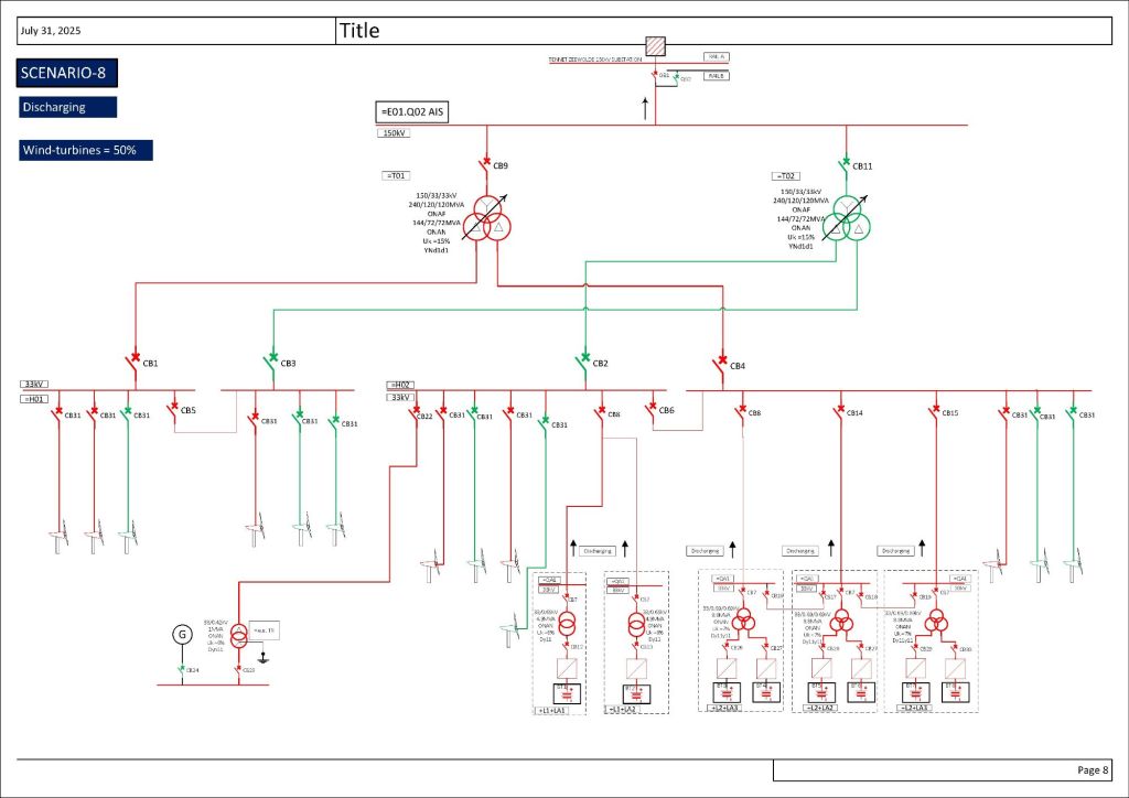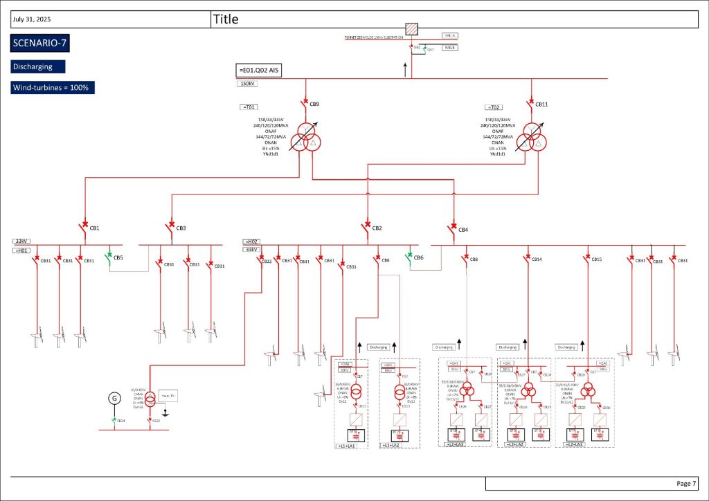 BESS plant has been connected to an upstream 150kV national grid that is already energized by wind turbines (Wind Park). Batteries could be charged by upstream grid or discharged to upstream grid.