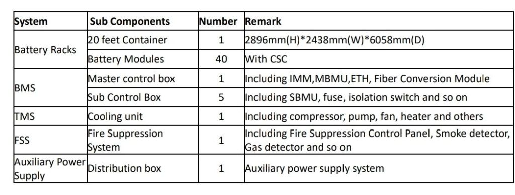 Battery containers consists of battery system, battery management system (BMS), fire suppression system (FSS), thermal management system (TMS) and auxiliary distribution system.